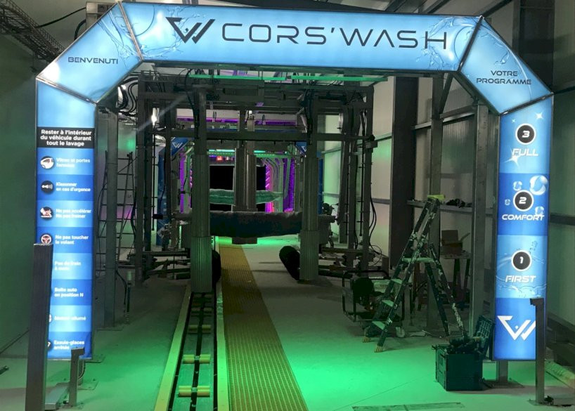 Przykład myjni tunelowej (konstrukcja stal nierdzewna) – pokazuje skalę inwestycji tunelowej oraz segment premium. |