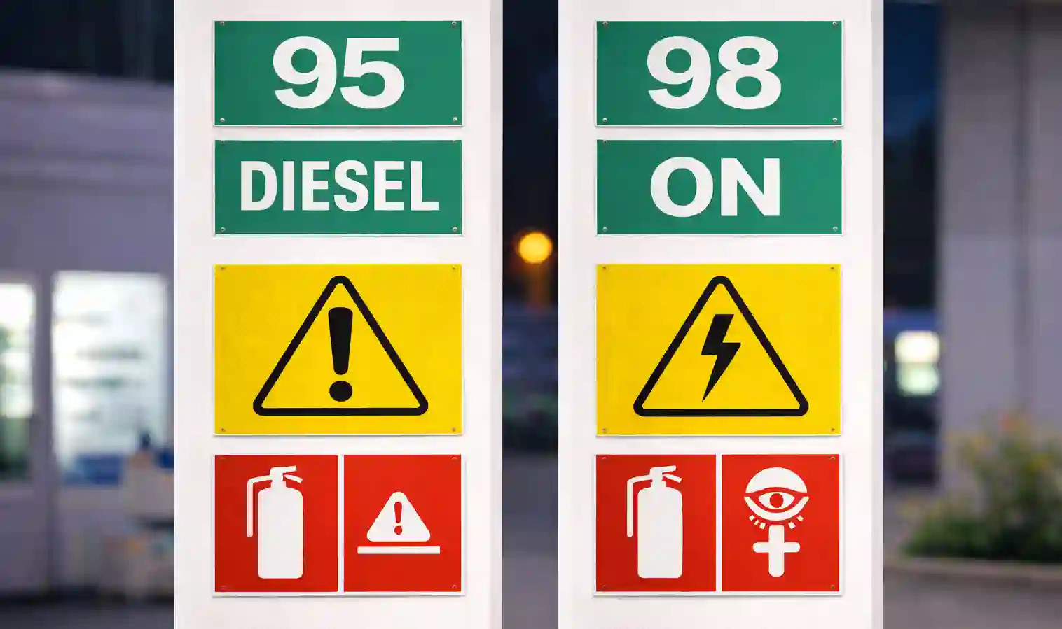 Kluczowe są oznaczenia paliw, organizacja ruchu oraz znaki ostrzegawcze i BHP. To one decydują o tym, czy użytkownik porusza się po stacji poprawnie, czy popełnia błędy prowadzące do zagrożeń.