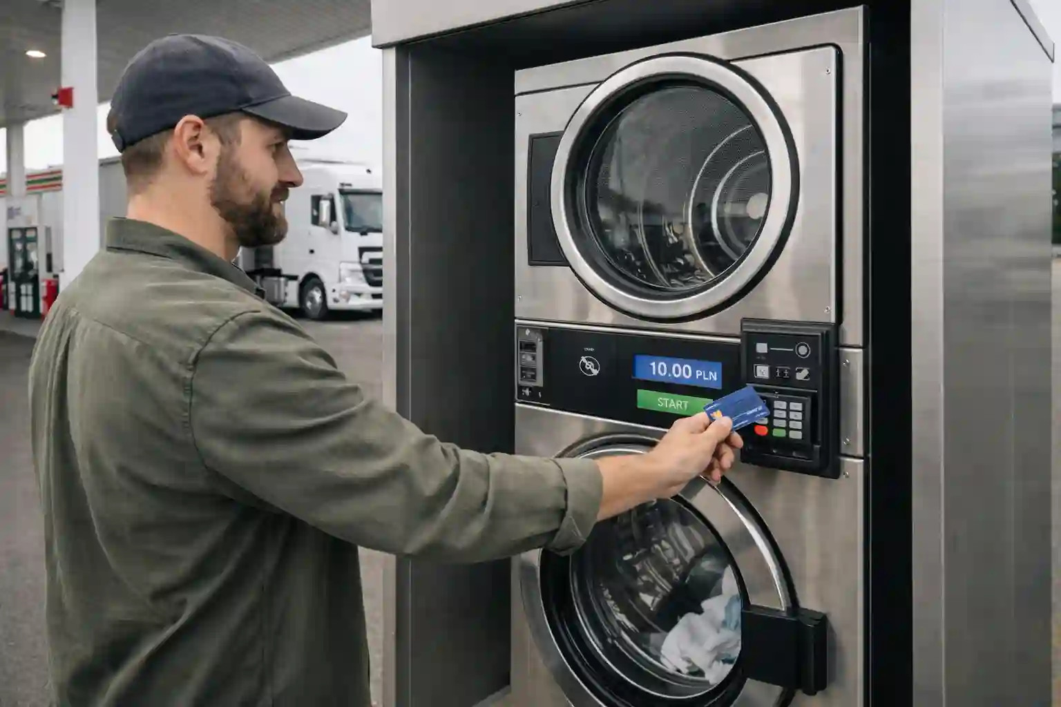 | Panel centralny (dla kilku usług) | Jeden panel rozlicza pranie i suszenie, a w rozbudowanych punktach może obsługiwać też inne usługi w strefie kierowcy. | Średni–wysoki | Sensowny, gdy stacja buduje strefę usług (np. prysznic / pranie / suszenie / inne automaty) i chce mieć spójne rozliczenia oraz raporty. Ograniczenie: opłaca się głównie, gdy punkt ma wyższy obrót lub kilka urządzeń/usług do spięcia. |