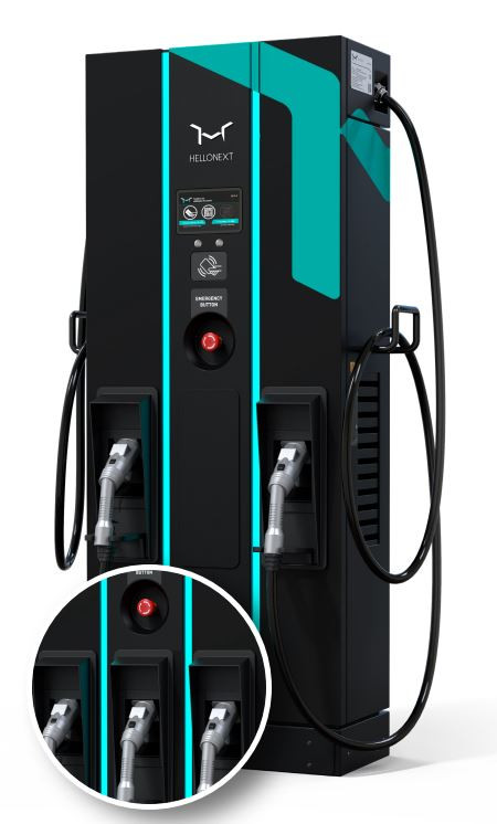 Model Hellonext H2 60 to szybka ładowarka z możliwością równoczesnego ładowania do trzech pojazdów (2 x DC, 1 x AC) przy opcjonalnym wykorzystaniu dodatkowego gniazda AC. Ładowarka jest łatwa w instalacji i serwisowaniu. Dzięki możliwości zastosowania wielostandardowych wtyczek, można w pełni dostosować urządzenie do ładowania konkretnej marki pojazdu.