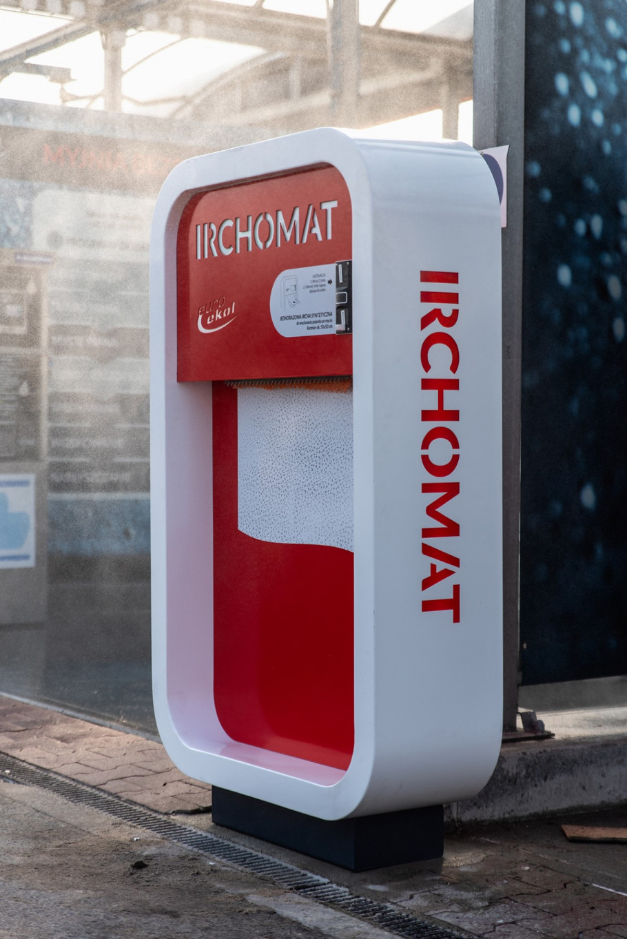 Automat do sprzedaży ręczników jednorazowych z irchy syntetycznej Irchomat to innowacyjne na skalę europejską urządzenie do sprzedaży ściereczek z irchy syntetycznej. Za pomocą irchy możemy w łatwy i szybki sposób pozbyć się resztek wody po procesie mycia pojazdu. Montaż urządzenia jest prosty i potrzebuje tylko zasilania 230V, przewidziany na wysepce przy odkurzaczu.