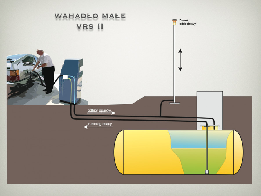 Zacznijmy od dużego wahadła gazowego. Cysterna podłączona jest do spustu dwoma wężami. Jeden służy do spustu paliwa a drugi do odbioru oparów, aby podczas wypełniania zbiornika pary benzyn nie wydostawały się na zewnątrz, tylko były gromadzone w wolnej przestrzeni pozostałej po spuszczanym paliwie. Nad całością czuwa zawór oddechowy dla benzyn, którego parametry nie pozwalają wydostać się parom benzyn na zewnątrz i jednocześnie zabezpiecza on zbiornik przed nadmiernym ciśnieniem. W razie nieprawidłowości która mogłaby wystąpić w instalacji, zapobiega uszkodzeniu technologii. Jak widzimy, takie rozwiązanie jest bardzo proste, nie wymaga dodatkowego zasilania (odbywa się grawitacyjnie) i jest bardzo skuteczne. Prawidłowo wykonana instalacja dużego wahadła przechwytuje nawet 100% par benzyn.
